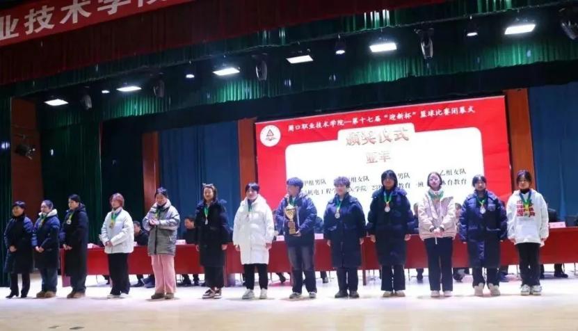 2023年12月21日下午4:00,周口职业技术学院第十七届“迎新杯”篮球赛闭幕颁奖仪式在体育馆举行。医学院党总支书记苑建伟、学管副院长王向华、团总支书记聂蕾及获奖运动员参加此次活动。我院荣获本次比赛优秀组织奖,优秀教练员奖、乙组女子亚军。