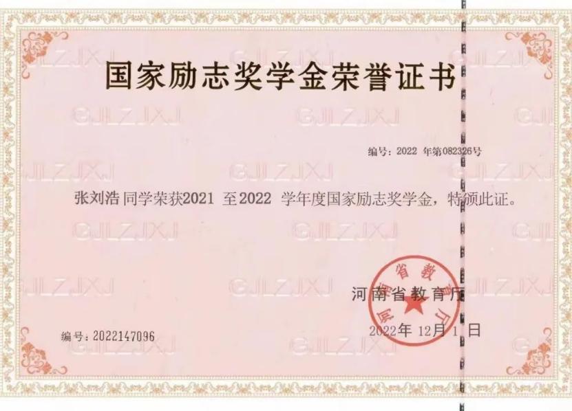 张刘浩,男,中共预备党员,就读于周口职业技术学院医学院药学专业学生。在校期间,通过勤奋努力,获得本学年度学习成绩专业排名第一。先后获得“国家励志奖学金”、“国家奖学金”、第十七届全国高职院校“发明杯”大学生专利创新大赛三等奖(作品:电“脑”恒温蜡疗仪)、2022年12月 荣获第十七届全国高职院校“发明杯”大学生专利创新大赛三等奖(作品:内燃机尾气处理用混合装置、内燃机动力系统)河南省普通高等学校“优秀学生干部”、学校“优秀共青团团员”、“优秀学生干部”、“社团先进个人”“三好学生”等荣誉。