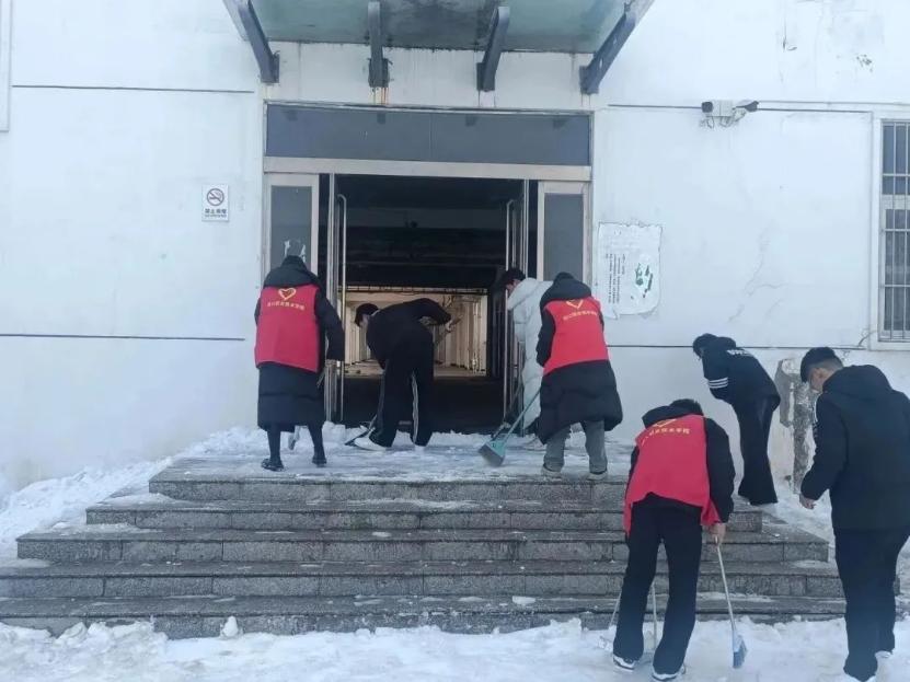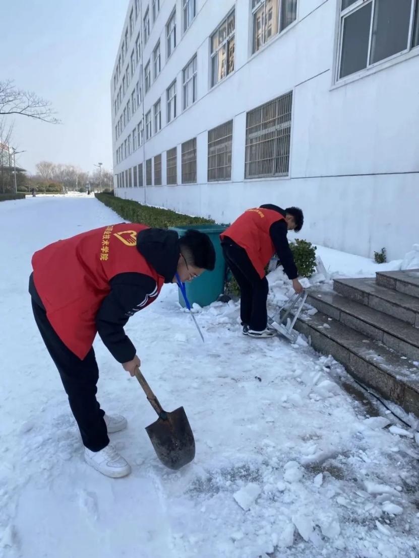 为使校园道路更加畅通,自律委员会成员自发到教学楼清理台阶积雪,虽然道路上的积雪已被压实,清扫工作变得异常具有挑战性,但是志愿者们毫不畏寒,手握铁锹和铁铲,相互协作,齐心协力,只为将校园道路上的积雪和冰块尽快清除,让师生们可以安全畅通地出行,志愿者们用实际行动展示出团结协作的力量,展现青春的活力和担当的精神。