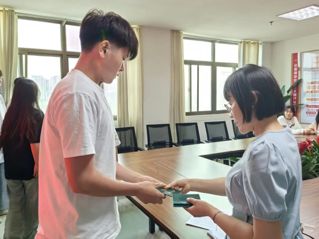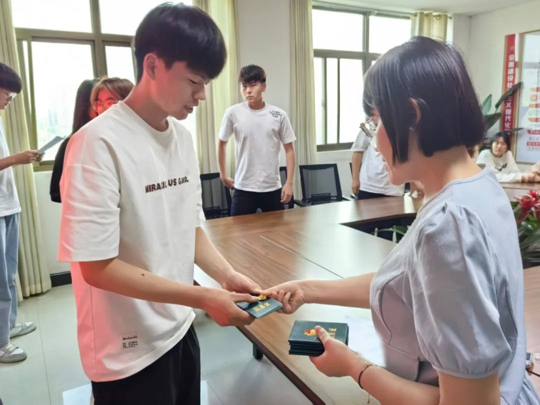 聂蕾宣读新发展团员名单并为他们颁发团员证和团徽。