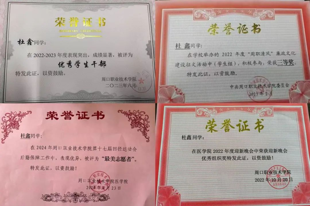 杜鑫,22级康复治疗技术专业学生。现担任自律委员会纪律部长一职。她综合测评成绩在班级排名第二,荣获“国家励志奖学金”、校级“优秀学生干部”、校级“周职清风廉政文化三等奖”、院级“优秀组织奖”等荣誉称号。志愿服务方面,参加第十七届田径运动会后勤保障工作,积极为同学服务,被评为“最美志愿者”称号。通过这些活动充实了她的大学生活,让她在各方面得到了锻炼提高。
