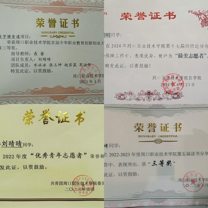 刘晴晴,医学院22级康复治疗技术专业学生,她的综合测评成绩在专业中排名第八名。现任医学院团总支文体部部长。曾荣获周口市优秀青年志愿者、校优秀青年志愿者、积极参加了学校的各类社团文体活动,获得周口职业技术学院第五届读书分享会知识竞答“三等奖”、第七届“经典照亮人生”诵读情景剧展演奖、首届中华职业教育创新创业大赛三等奖、周口职业技术学院首届健美健身操比赛“三等奖”等多种奖项。在工作中她始终保持严谨的工作态度,对辅导员下达的各项任务积极配合,认真落实,做好辅导员与同学们之间上传下达的工作,全心全意为同学们服务,认真履行职责,全面提高了自己的思想认识、工作能力和综合素质积极参加协助举办校内活动,刘晴晴同学还积极组织参与院系班级开展的各项活动。如:五子棋比赛、参与学校运动会、心理健康趣味运动会、“学习团的基础知识”等主题团课等一系列活动。