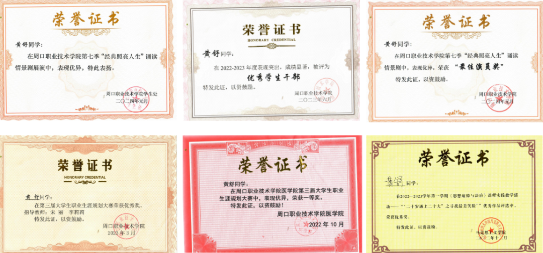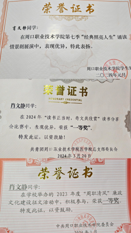 肖文静,23级医学影像技术专业学生,综合测评成绩在班级位于前列。在校期间,她参与了学校多项比赛,在2023年度“周职清风”廉政文化建设征文活动中荣获一等奖,在"读书正当时,奇文共欣赏”读书分享会比赛中荣获一等奖,在周口职业技术学院第七季“经典照亮人生”诵读情景剧展演中获荣誉证书,在学院第一届英语话剧比赛中获团体三等奖。她不仅在课堂上表现出色,还积极参与社会实践活动,她与团队所参与的2024年“挑战杯”中国大学生创业计划竞赛项目入选省赛,这些经历不仅丰富了她的大学生活,也提升了她的社会责任感,也体现了她自强不息的优秀品质。