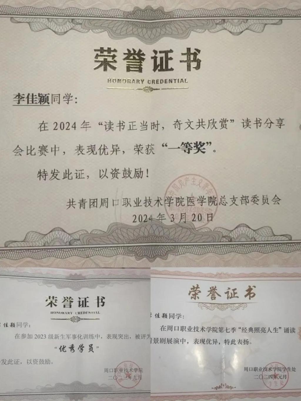 李佳颖,23级医学影像技术专业学生,她勤于学习,善于思考,综合测评排名靠前,军训被评为“优秀学员”。此外,她还积极参加学校举办的各类活动,如“经典照亮人生”诵读比赛、读书分享会、英语话剧比赛等活动,并取得不错的成绩。她尊老爱幼,主动帮助有困难的人,参加志愿者活动去养老服务中心慰问老人,关心老人身体健康,始终保持着热情与耐心,让他们在活动中感受到温暖与关怀,不仅为老人们带来了欢乐与陪伴,也进一步传递了爱心与奉献精神。
