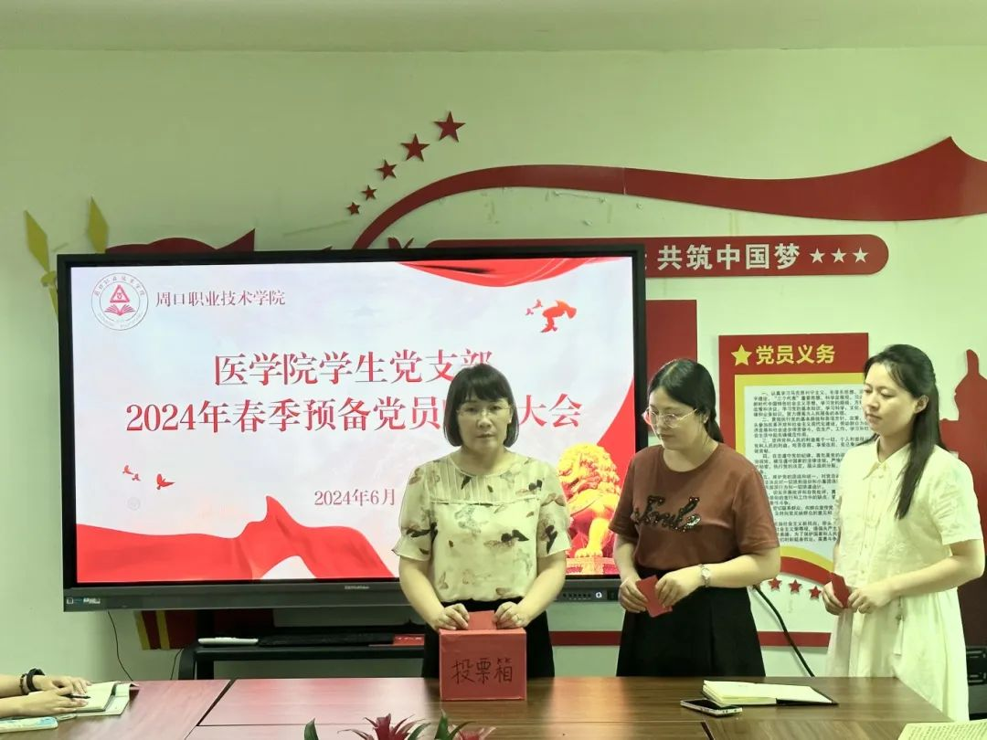 为进一步加强党员队伍建设,切实提高学生党员发展质量,保持党员队伍的先进性和纯洁性,壮大党员队伍力量。6月12日,周口职业技术学院医学院在行政楼四楼党员活动室开展2024年春季预备党员吸收大会。学生党支部书记聂蕾、学生党支部组织委员李莉莉及全体发展对象参加本次会议。大会由李莉莉主持。