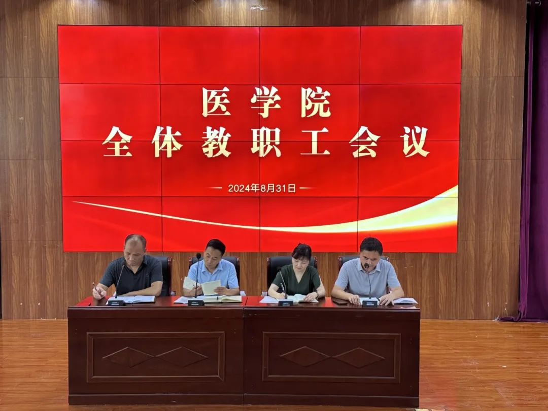 会上,副院长郭瑞传达了学校教学工作会议精神。院长刘敏对医学院上学期工作进行了总结,安排部署新学期重点工作。刘院长强调,要深化内涵建设,不断提高教学质量。党总支书记苑建伟带领大家学习了党的二十届三中全会精神,并就做好学校安全和迎新工作进行了具体安排部署。