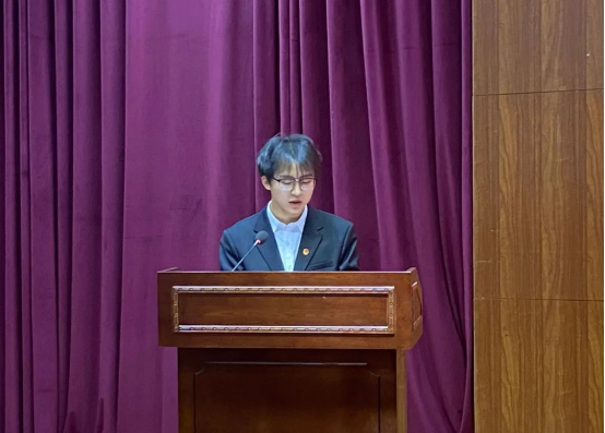 张政宇同学作为学员代表发言,他表达了自己对于中国共产党的忠实拥护和目标追寻,并讲述自己在思想、学习、实践三个方面的具体行动。他号召全体学员通过培训提高自身素质和党性修养,为国家的建设贡献力量,同时也带头表态:将以此次培训班为新的起点,坚定理想、对党忠诚、勤学善悟、脚踏实地,把党的理论作为自身的思想武器,将所学所悟践行到日常所行,用青春的能动力和创造力激荡起民族复兴的澎湃浪潮。