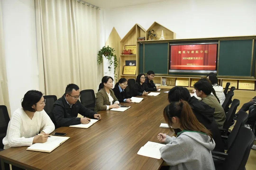 1018日,建筑与港航学院在学院6229会议室召开了2024级新生座谈会。此次座谈会旨在加强学院与新生之间的沟通与理解,帮助新生快速适应大学生活,同时收集新生对学院教学、生活等方面的意见和建议。座谈会由副院长宁丽平主持,院长刘胜杰、副院长杨改等学院相关领导出席会议,2024级各班级班长、团支书和新生代表参加了此次座谈会。